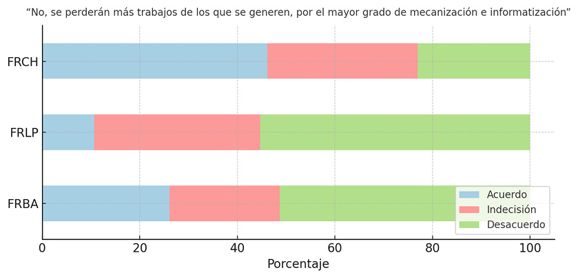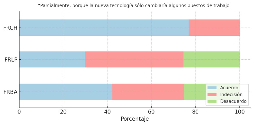 En síntesis, FRBA valida fuertemente esta concepción simplificada del vínculo entre tecnología y futuro laboral, lo que evidencia una urgente necesidad de intervención didáctica para problematizar estos imaginarios. FRLP, en cambio, exhibe un perfil más crítico o matizado, posiblemente relacionado con diferencias curriculares o pedagógicas. FRCH, por su parte, refleja indecisión o falta de herramientas conceptuales, abriendo una oportunidad para fortalecer marcos interpretativos más sólidos.